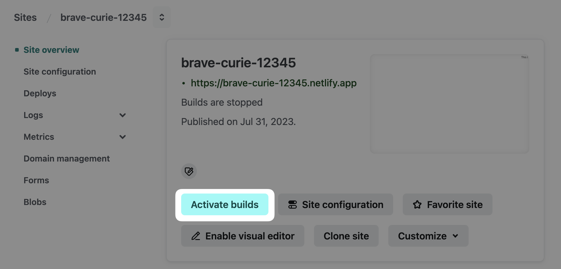 Section titled “Activate builds”By default, builds are active. If builds have been stopped for a site, there are multiple ways you can activate them. You can: