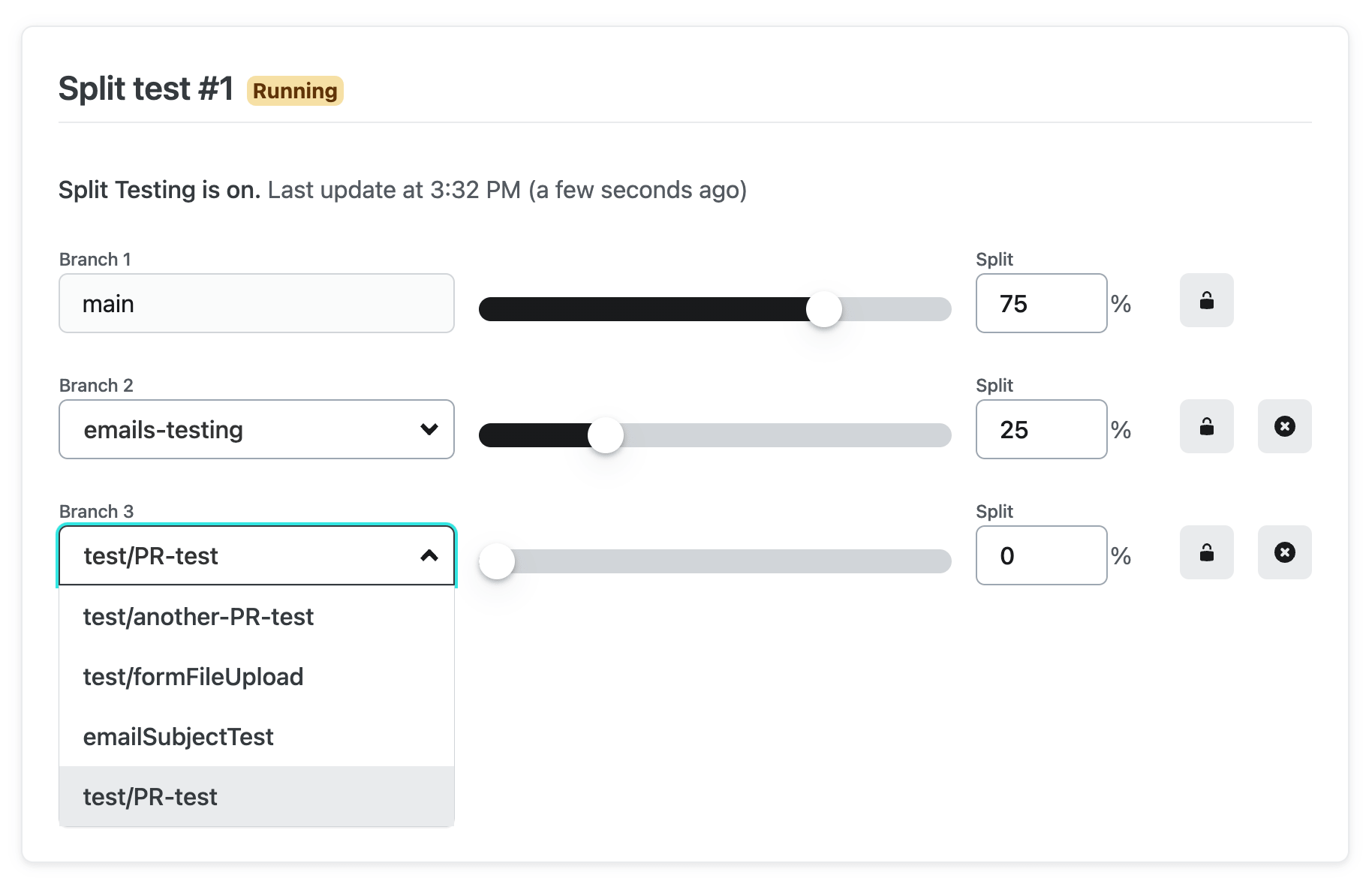 If needed, you can add more deployed branches to the test by selecting Add another branch. Traffic distribution percentages will automatically adjust so they always add up to 100%.